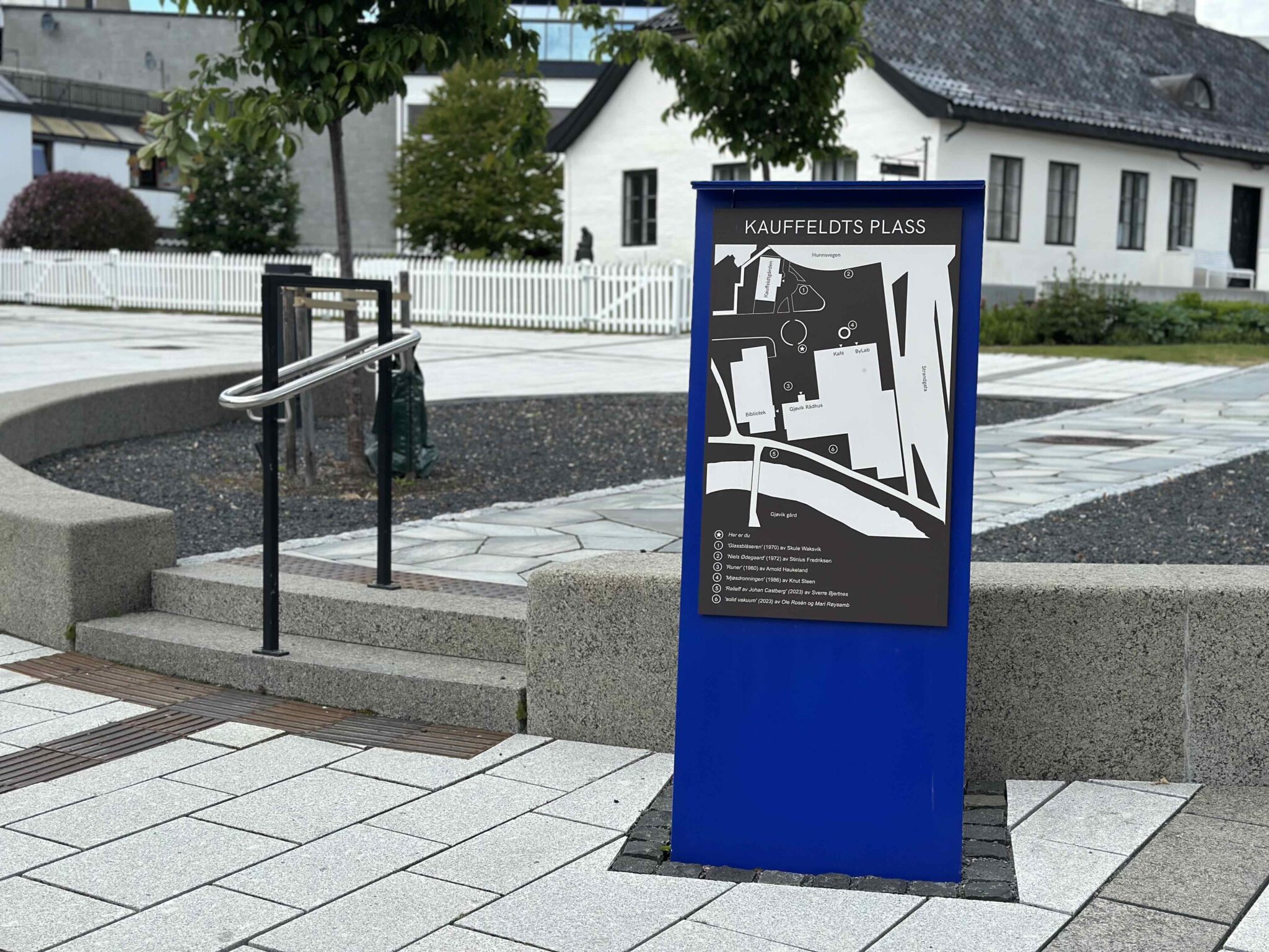 Gjøvik rådhus er et bygg for alle kommunens innbyggere, og derfor var universell utforming (UU) en sentral del av leveransen. Vi produserte blant annet et taktilt kartskilt spesifikt for Kaufeldtplass rett utenfor bygget, slik at svaksynte og blinde kan orientere seg og gjøre seg kjent med kunstverkene som omringer rådhuset. Skiltet har stor kontrast mellom bakgrunn og elementer, og er i tillegg følbart.