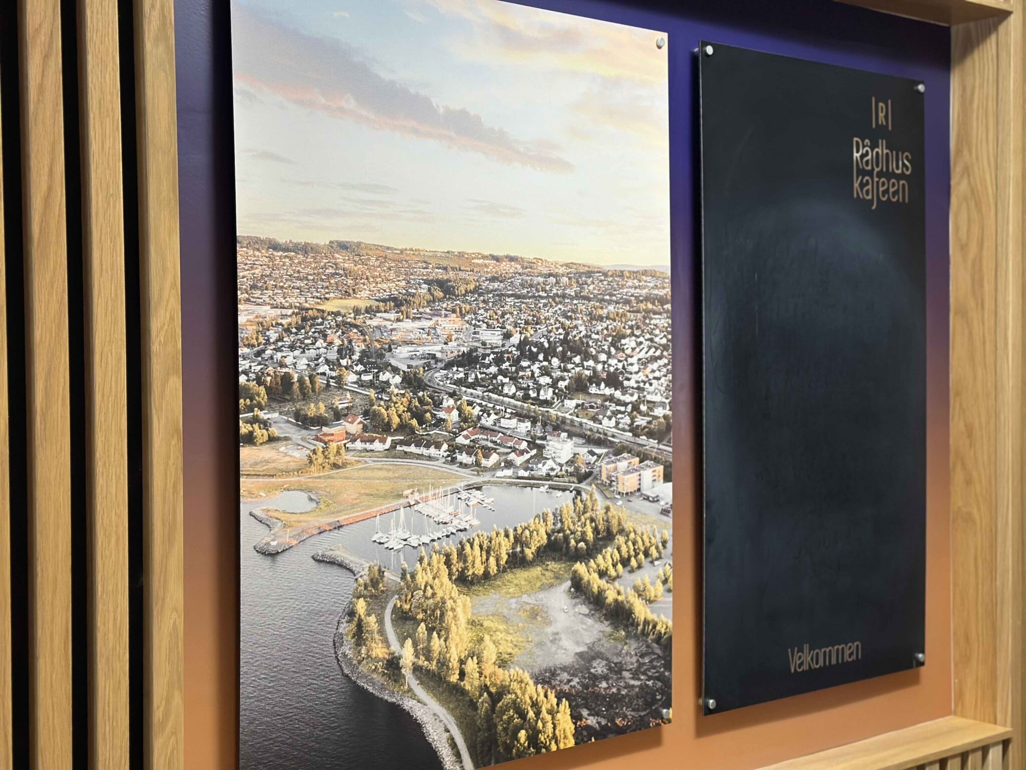 Som en kreativ bonus fikk vi også ansvaret for profileringen av rådhusets sosiale hjerte: Rådhuskafeen. Her strakk oppdraget seg utover fysisk produksjon, det var vi som også designet både logo og grafisk profil. Målet var å gi kaféen en egen, lun identitet som skiller seg noe ut fra den mer formelle kommuneprofilen, samtidig som den hører naturlig til i rådhuset.