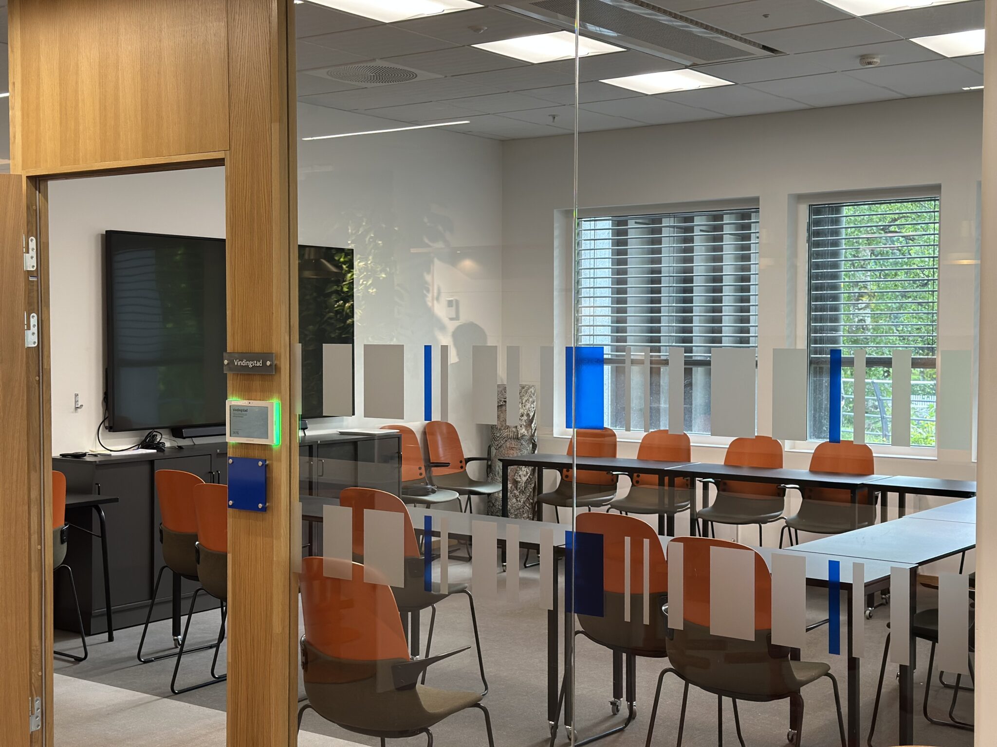 Videre inn i bygget fortsetter den røde tråden, men her med andre materialer tilpasset interiøret. Glassdekor sørger ikke bare for diskresjon, men også flotte designdetaljer som følger kommunens profil.